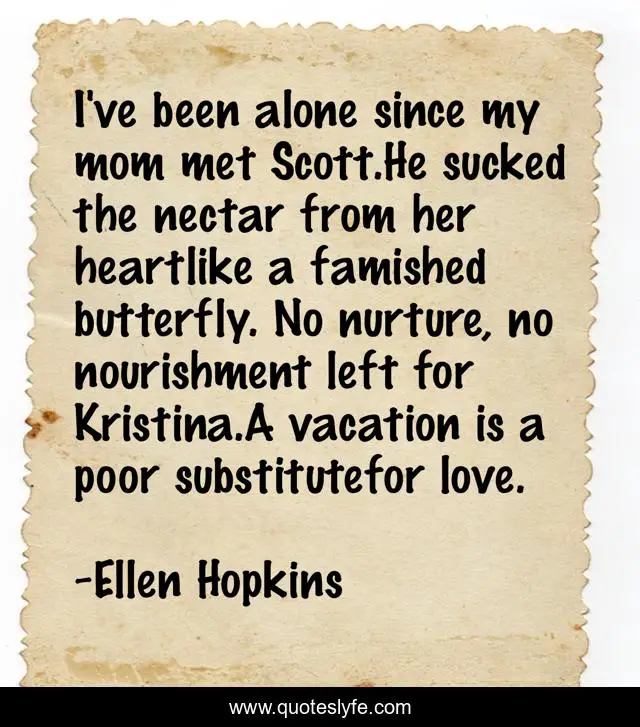 This page presents the quote "I've been alone since my mom met Scott.He sucked the nectar from her heartlike a famished butterfly. No nurture, no nourishment left for Kristina.A vacation is a poor substitutefor love.". Author of this quote is Ellen Hopkins. This quote is about teen, life, parents,.