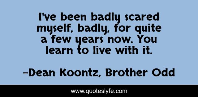 This page presents the quote "I've been badly scared myself, badly, for quite a few years now. You learn to live with it.". Author of this quote is Dean Koontz, Brother Odd. This quote is about fear, acceptance, brother-john, life, odd-thomas,.