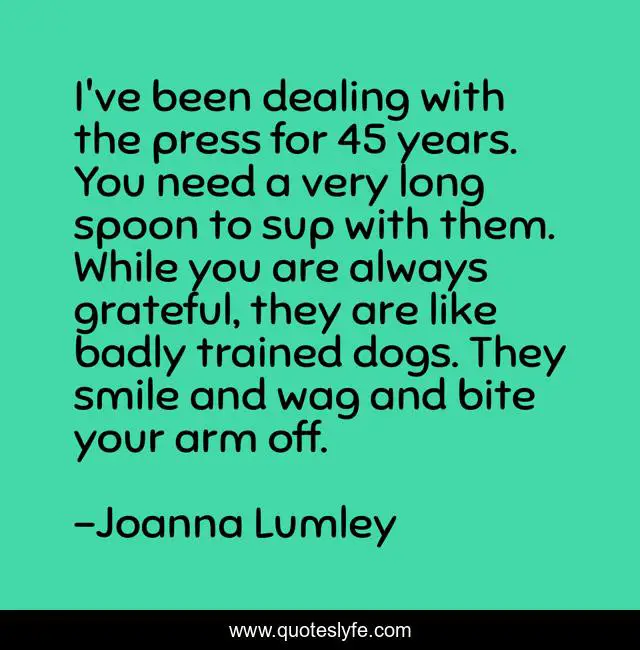 This page presents the quote "I've been dealing with the press for 45 years. You need a very long spoon to sup with them. While you are always grateful, they are like badly trained dogs. They smile and wag and bite your arm off.". Author of this quote is Joanna Lumley. This quote is about grateful, long,.
