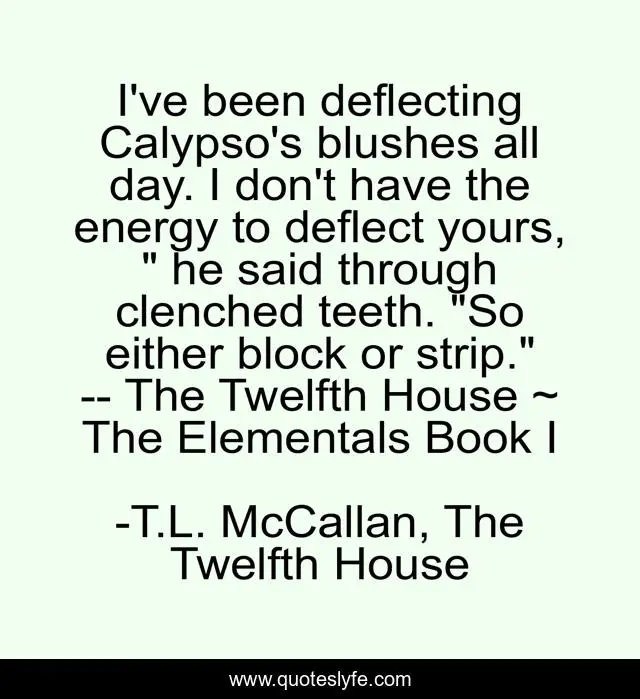 This page presents the quote "I've been deflecting Calypso's blushes all day. I don't have the energy to deflect yours, " he said through clenched teeth. "So either block or strip." -- The Twelfth House ~ The Elementals Book I". Author of this quote is T.L. McCallan, The Twelfth House. This quote is about romance, fantasy, fantasy-romance, paranormal, paranormal-romance,.