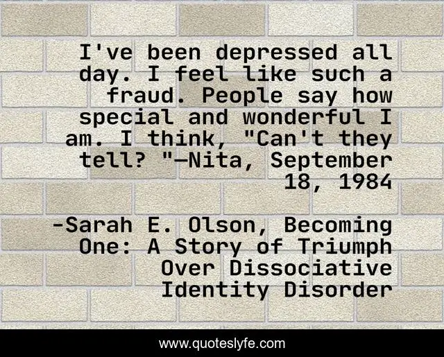 This page presents the quote "I've been depressed all day. I feel like such a fraud. People say how special and wonderful I am. I think, "Can't they tell? "—Nita, September 18, 1984". Author of this quote is Sarah E. Olson, Becoming One: A Story of Triumph Over Dissociative Identity Disorder. This quote is about fraud, disbelief, self-belief, self-hate, self-contempt, depression, self-esteem,.