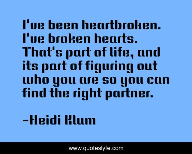 This page presents the quote "I've been heartbroken. I've broken hearts. That's part of life, and its part of figuring out who you are so you can find the right partner.". Author of this quote is Heidi Klum. This quote is about partner, life, broken,.