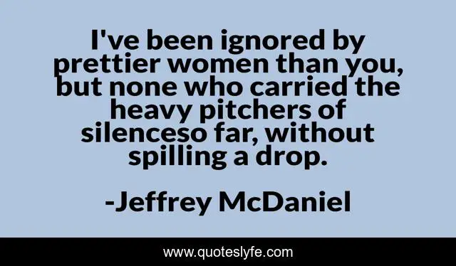 This page presents the quote "I've been ignored by prettier women than you, but none who carried the heavy pitchers of silenceso far, without spilling a drop.". Author of this quote is Jeffrey McDaniel. This quote is about ignore, love, silence, affection, women,.