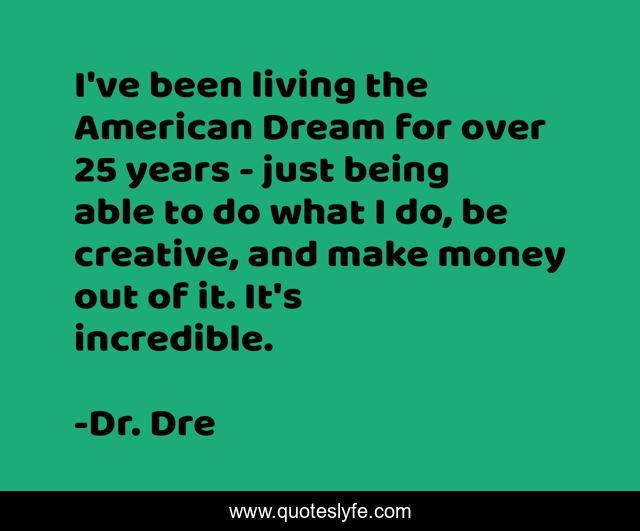 This page presents the quote "I've been living the American Dream for over 25 years - just being able to do what I do, be creative, and make money out of it. It's incredible.". Author of this quote is Dr. Dre. This quote is about american dream, american,.