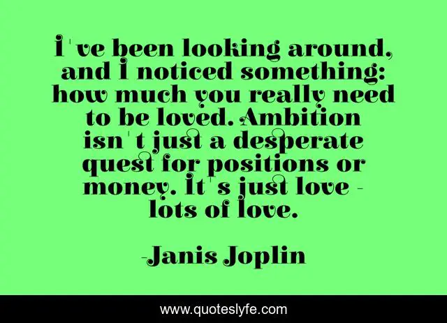 This page presents the quote "I've been looking around, and I noticed something: how much you really need to be loved. Ambition isn't just a desperate quest for positions or money. It's just love - lots of love.". Author of this quote is Janis Joplin. This quote is about looking, love, affection, ambition,.