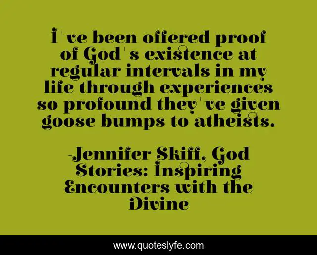 This page presents the quote "I've been offered proof of God's existence at regular intervals in my life through experiences so profound they've given goose bumps to atheists.". Author of this quote is Jennifer Skiff, God Stories: Inspiring Encounters with the Divine. This quote is about atheist, proof-of-god, profound-realizations, god, divine, divine-intervention,.