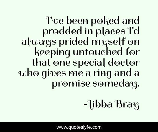 This page presents the quote "I've been poked and prodded in places I'd always prided myself on keeping untouched for that one special doctor who gives me a ring and a promise someday.". Author of this quote is Libba Bray. This quote is about marriage, going-bovine, doctors,.