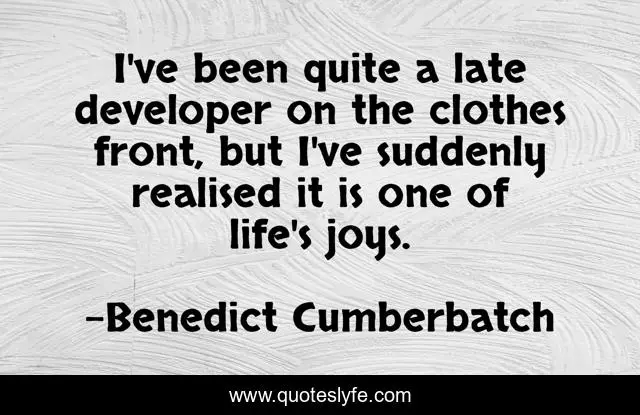 This page presents the quote "I've been quite a late developer on the clothes front, but I've suddenly realised it is one of life's joys.". Author of this quote is Benedict Cumberbatch. This quote is about late, joy, clothes,.
