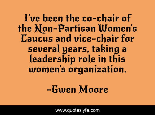 This page presents the quote "I've been the co-chair of the Non-Partisan Women's Caucus and vice-chair for several years, taking a leadership role in this women's organization.". Author of this quote is Gwen Moore. This quote is about organization, women, years,.