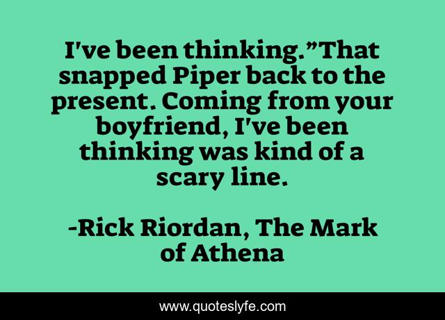 This page presents the quote "I've been thinking.”That snapped Piper back to the present. Coming from your boyfriend, I've been thinking was kind of a scary line.". Author of this quote is Rick Riordan, The Mark of Athena. This quote is about thinking, boyfriend,.