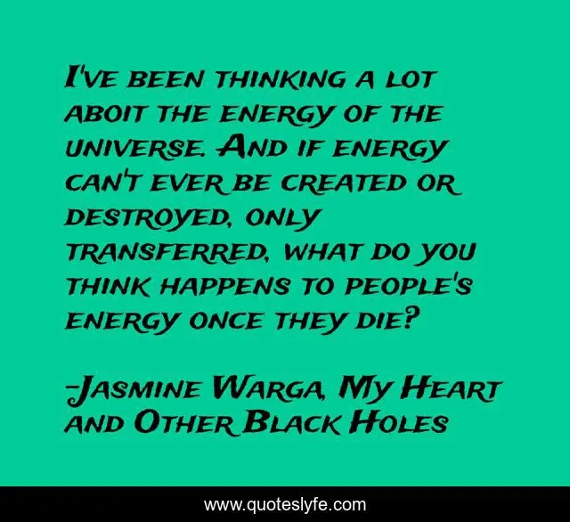 This page presents the quote "I've been thinking a lot aboit the energy of the universe. And if energy can't ever be created or destroyed, only transferred, what do you think happens to people's energy once they die?". Author of this quote is Jasmine Warga, My Heart and Other Black Holes. This quote is about science, energy, death, depression,.