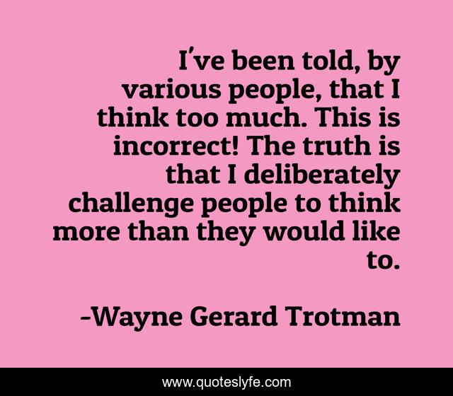 This page presents the quote "I've been told, by various people, that I think too much. This is incorrect! The truth is that I deliberately challenge people to think more than they would like to.". Author of this quote is Wayne Gerard Trotman. This quote is about thinking, thought, challenge, truth, people,.
