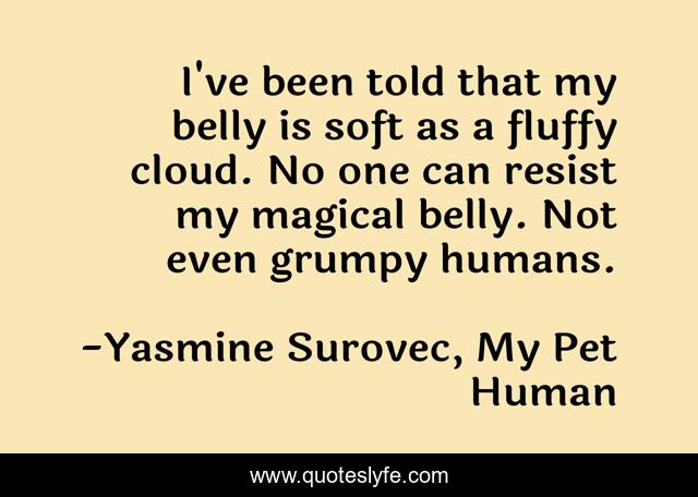This page presents the quote "I've been told that my belly is soft as a fluffy cloud. No one can resist my magical belly. Not even grumpy humans.". Author of this quote is Yasmine Surovec, My Pet Human. This quote is about cats, cats-humor,.