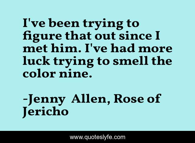 This page presents the quote "I've been trying to figure that out since I met him. I've had more luck trying to smell the color nine.". Author of this quote is Jenny Allen, Rose of Jericho. This quote is about sarcasm, humor,.