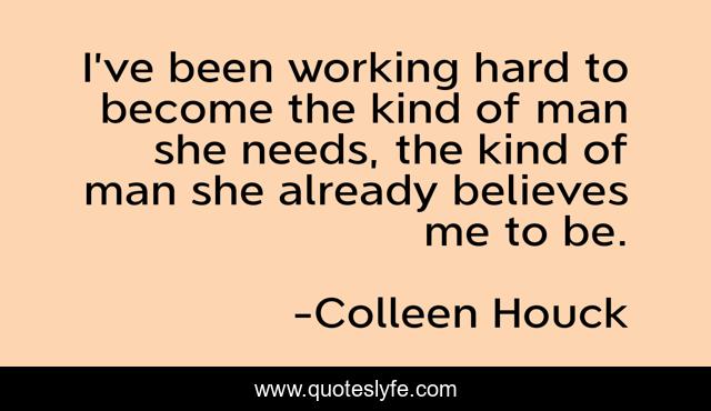 This page presents the quote "I’ve been working hard to become the kind of man she needs, the kind of man she already believes me to be.". Author of this quote is Colleen Houck. This quote is about romance, love, affection,.