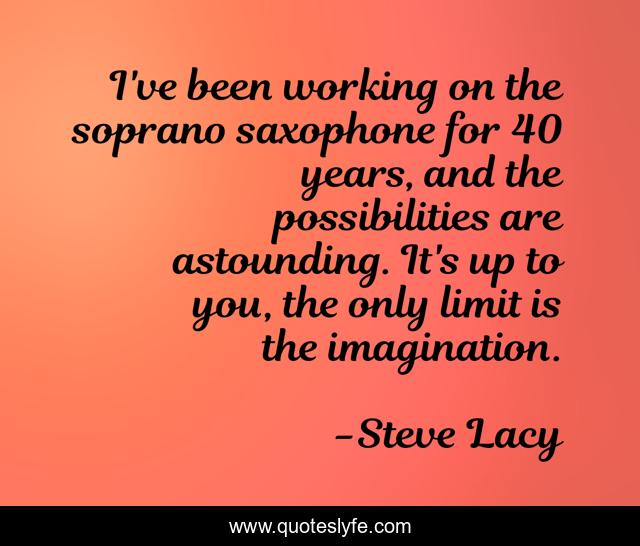 This page presents the quote "I've been working on the soprano saxophone for 40 years, and the possibilities are astounding. It's up to you, the only limit is the imagination.". Author of this quote is Steve Lacy. This quote is about limit, working,.