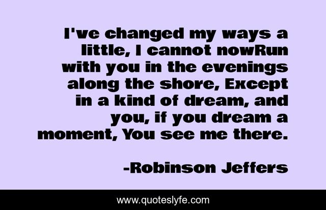This page presents the quote "I've changed my ways a little, I cannot nowRun with you in the evenings along the shore, Except in a kind of dream, and you, if you dream a moment, You see me there.". Author of this quote is Robinson Jeffers. This quote is about death, memory, passage, time, dream, dogs,.