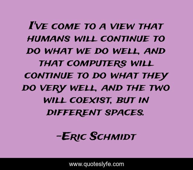 This page presents the quote "I've come to a view that humans will continue to do what we do well, and that computers will continue to do what they do very well, and the two will coexist, but in different spaces.". Author of this quote is Eric Schmidt. This quote is about well, two, view,.