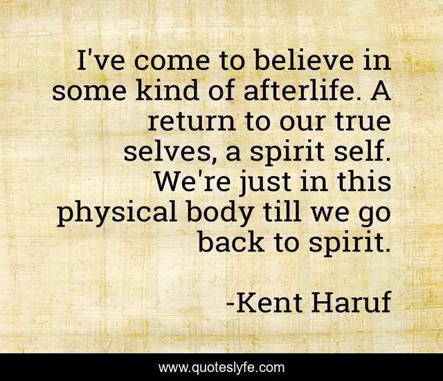 This page presents the quote "I've come to believe in some kind of afterlife. A return to our true selves, a spirit self. We're just in this physical body till we go back to spirit.". Author of this quote is Kent Haruf. .