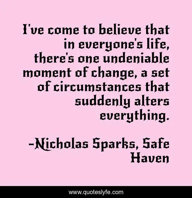 This page presents the quote "I've come to believe that in everyone's life, there's one undeniable moment of change, a set of circumstances that suddenly alters everything.". Author of this quote is Nicholas Sparks, Safe Haven. This quote is about life, change,.