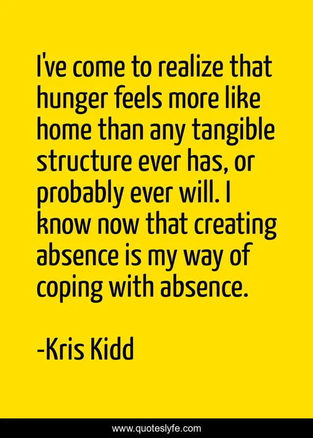 This page presents the quote "I've come to realize that hunger feels more like home than any tangible structure ever has, or probably ever will. I know now that creating absence is my way of coping with absence.". Author of this quote is Kris Kidd. This quote is about depression, eating-disorders, mental-illness, anorexia,.