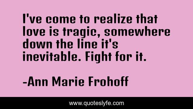 This page presents the quote "I've come to realize that love is tragic, somewhere down the line it's inevitable. Fight for it.". Author of this quote is Ann Marie Frohoff. This quote is about teen, loss, life, love, tumblr, author, writer, yalit, new-adult,.