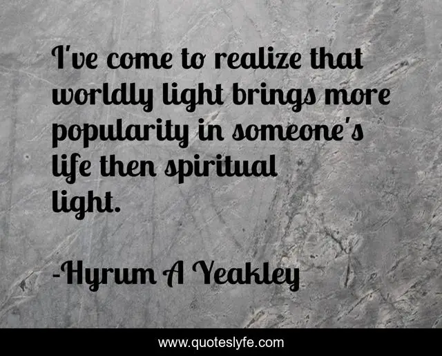 This page presents the quote "I've come to realize that worldly light brings more popularity in someone's life then spiritual light.". Author of this quote is Hyrum A Yeakley. This quote is about faith, life, light, spiritual, popular, world,.