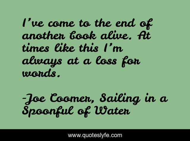 This page presents the quote "I’ve come to the end of another book alive. At times like this I’m always at a loss for words.". Author of this quote is Joe Coomer, Sailing in a Spoonful of Water. .