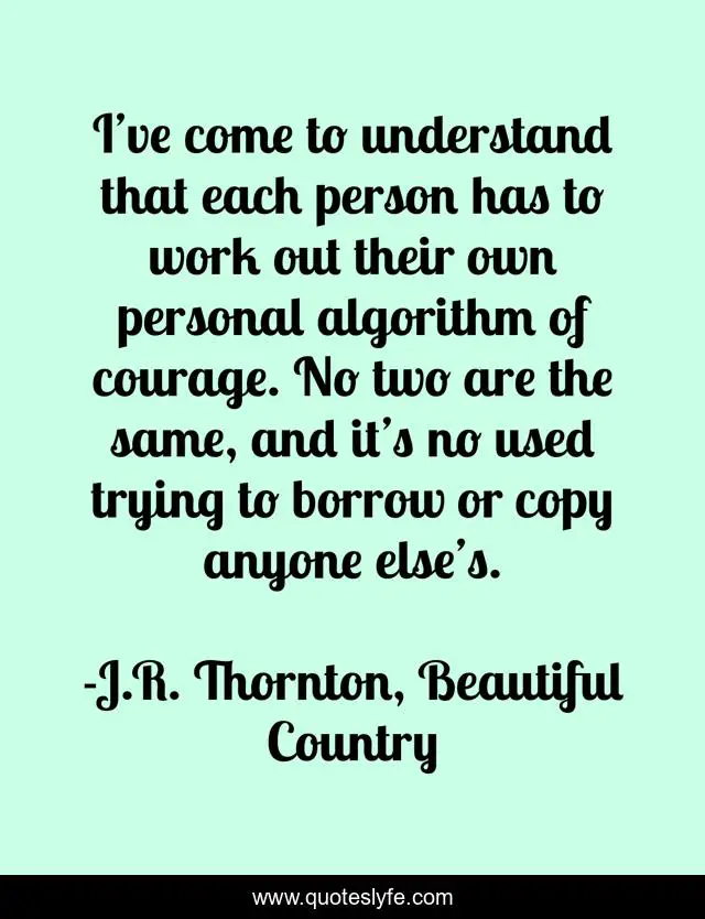 This page presents the quote "I’ve come to understand that each person has to work out their own personal algorithm of courage. No two are the same, and it’s no used trying to borrow or copy anyone else’s.". Author of this quote is J.R. Thornton, Beautiful Country. .