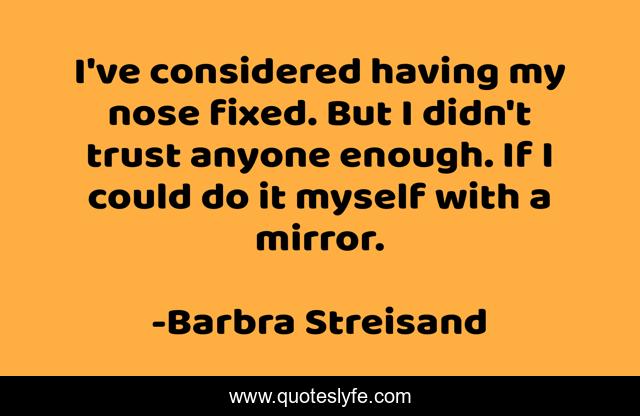 This page presents the quote "I've considered having my nose fixed. But I didn't trust anyone enough. If I could do it myself with a mirror.". Author of this quote is Barbra Streisand. This quote is about myself, nose, mirror,.