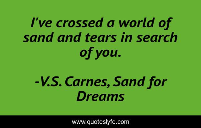 This page presents the quote "I've crossed a world of sand and tears in search of you.". Author of this quote is V.S. Carnes, Sand for Dreams. This quote is about romance, enthusiasm, inspirational,.