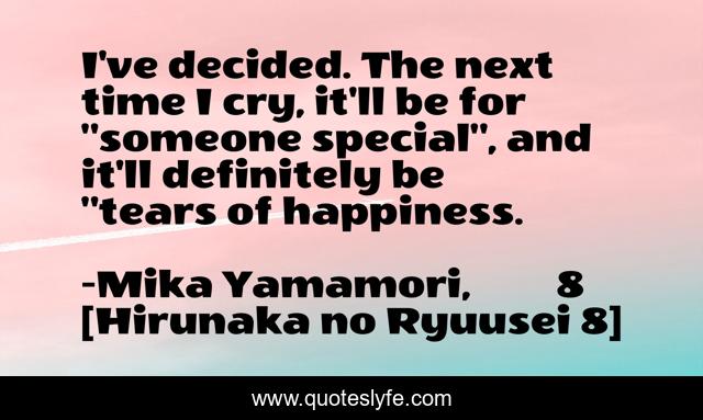 This page presents the quote "I've decided. The next time I cry, it'll be for "someone special", and it'll definitely be "tears of happiness.". Author of this quote is Mika Yamamori, ひるなかの流星 8 [Hirunaka no Ryuusei 8]. This quote is about heartache, loss, love, affection,.