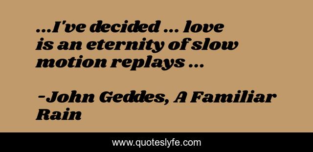 This page presents the quote "...I've decided ... love is an eternity of slow motion replays ...". Author of this quote is John Geddes, A Familiar Rain. This quote is about eternity, replays, love, affection, memory,.