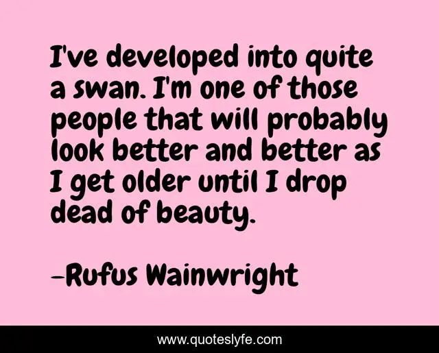 This page presents the quote "I've developed into quite a swan. I'm one of those people that will probably look better and better as I get older until I drop dead of beauty.". Author of this quote is Rufus Wainwright. This quote is about better, look, people,.