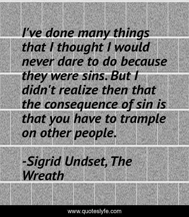 This page presents the quote "I've done many things that I thought I would never dare to do because they were sins. But I didn't realize then that the consequence of sin is that you have to trample on other people.". Author of this quote is Sigrid Undset, The Wreath. This quote is about catholic, sin,.