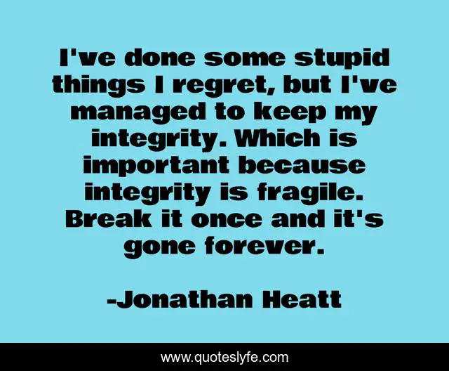 This page presents the quote "I've done some stupid things I regret, but I've managed to keep my integrity. Which is important because integrity is fragile. Break it once and it's gone forever.". Author of this quote is Jonathan Heatt. This quote is about integrity, g, man,.