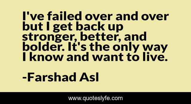 This page presents the quote "I've failed over and over but I get back up stronger, better, and bolder. It's the only way I know and want to live.". Author of this quote is Farshad Asl. This quote is about perseverance, farshad-asl, hard-work, sales, leadership, bold,.