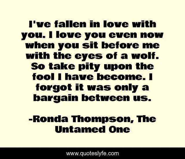 This page presents the quote "I've fallen in love with you. I love you even now when you sit before me with the eyes of a wolf. So take pity upon the fool I have become. I forgot it was only a bargain between us.". Author of this quote is Ronda Thompson, The Untamed One. This quote is about untamed-one, werewolf, paranormal, romance, werewolves, historical, ronda-thompson,.