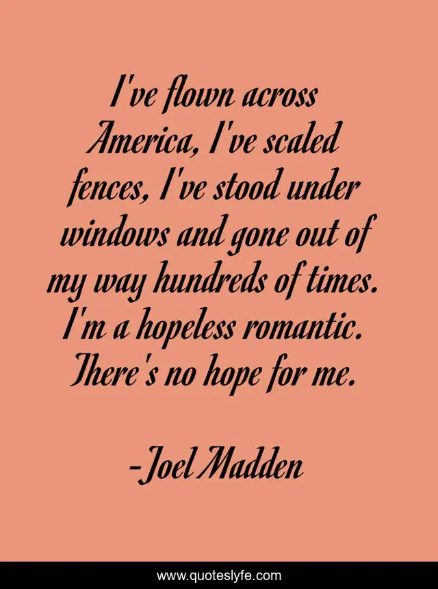 This page presents the quote "I've flown across America, I've scaled fences, I've stood under windows and gone out of my way hundreds of times. I'm a hopeless romantic. There's no hope for me.". Author of this quote is Joel Madden. This quote is about me, america, hope,.