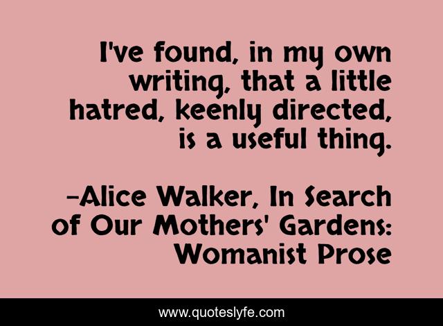 This page presents the quote "I've found, in my own writing, that a little hatred, keenly directed, is a useful thing.". Author of this quote is Alice Walker, In Search of Our Mothers' Gardens: Womanist Prose. .