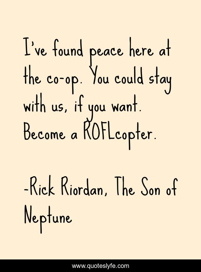 This page presents the quote "I've found peace here at the co-op. You could stay with us, if you want. Become a ROFLcopter.". Author of this quote is Rick Riordan, The Son of Neptune. This quote is about iris, percy-jackson,.