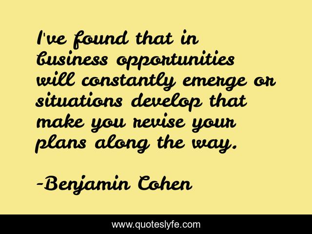 This page presents the quote "I've found that in business opportunities will constantly emerge or situations develop that make you revise your plans along the way.". Author of this quote is Benjamin Cohen. This quote is about opportunities, way,.