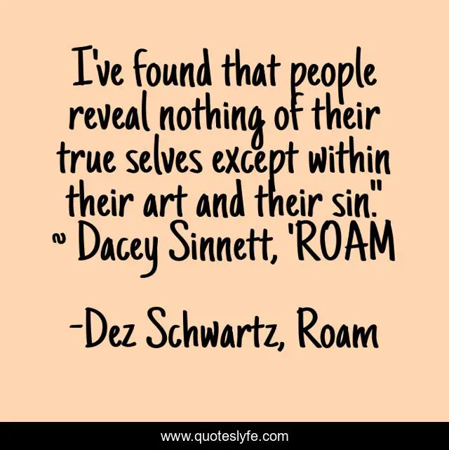 This page presents the quote "I've found that people reveal nothing of their true selves except within their art and their sin." ~ Dacey Sinnett, 'ROAM". Author of this quote is Dez Schwartz, Roam. This quote is about human-nature, art, honesty, sin,.