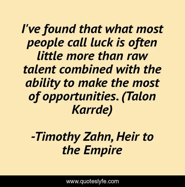 This page presents the quote "I've found that what most people call luck is often little more than raw talent combined with the ability to make the most of opportunities. (Talon Karrde)". Author of this quote is Timothy Zahn, Heir to the Empire. This quote is about star-wars, luck,.