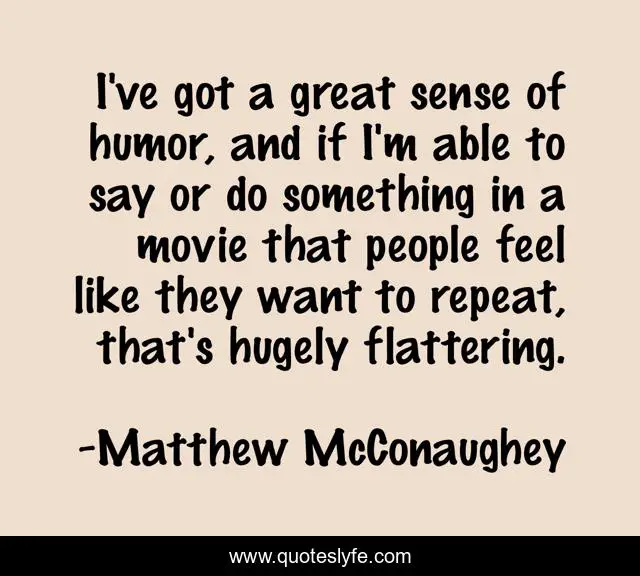 This page presents the quote "I've got a great sense of humor, and if I'm able to say or do something in a movie that people feel like they want to repeat, that's hugely flattering.". Author of this quote is Matthew McConaughey. This quote is about great, people,.