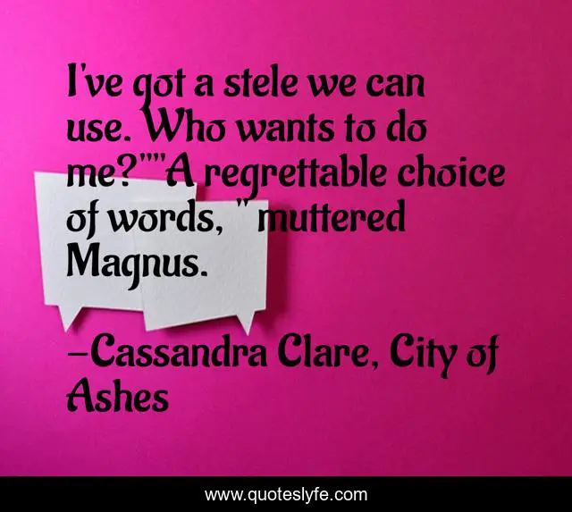 This page presents the quote "I've got a stele we can use. Who wants to do me?""A regrettable choice of words, " muttered Magnus.". Author of this quote is Cassandra Clare, City of Ashes. This quote is about magnus-bane, jace-wayland, regret, stele,.