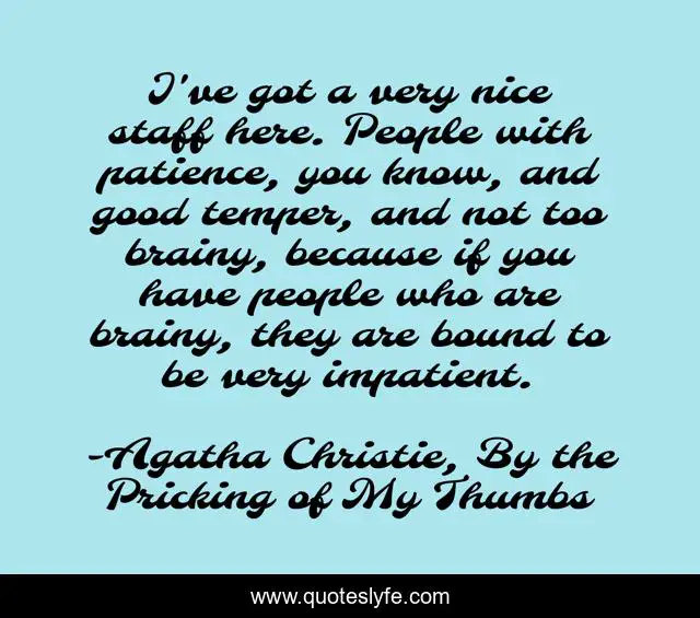 This page presents the quote "I've got a very nice staff here. People with patience, you know, and good temper, and not too brainy, because if you have people who are brainy, they are bound to be very impatient.". Author of this quote is Agatha Christie, By the Pricking of My Thumbs. This quote is about intelligence, brain, patience,.