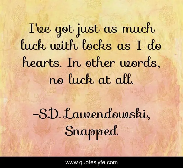 This page presents the quote "I've got just as much luck with locks as I do hearts. In other words, no luck at all.". Author of this quote is S.D. Lawendowski, Snapped. This quote is about humor, unlucky, locks, key, hearts, luck,.