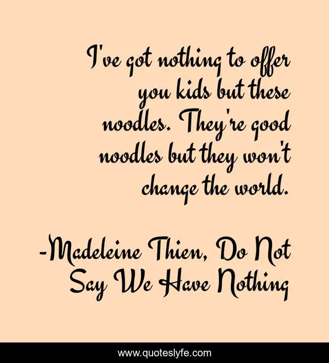 This page presents the quote "I've got nothing to offer you kids but these noodles. They're good noodles but they won't change the world.". Author of this quote is Madeleine Thien, Do Not Say We Have Nothing. This quote is about riots, sharing, noodles, revolutions, community,.