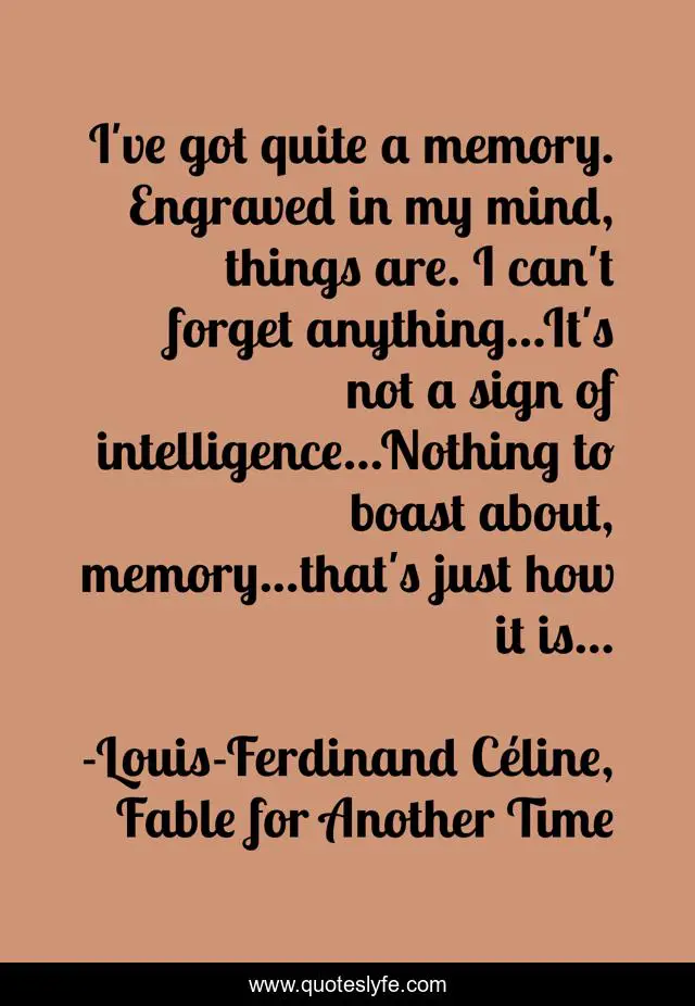 This page presents the quote "I've got quite a memory. Engraved in my mind, things are. I can't forget anything...It's not a sign of intelligence...Nothing to boast about, memory...that's just how it is...". Author of this quote is Louis-Ferdinand Céline, Fable for Another Time. This quote is about intelligence, memory,.
